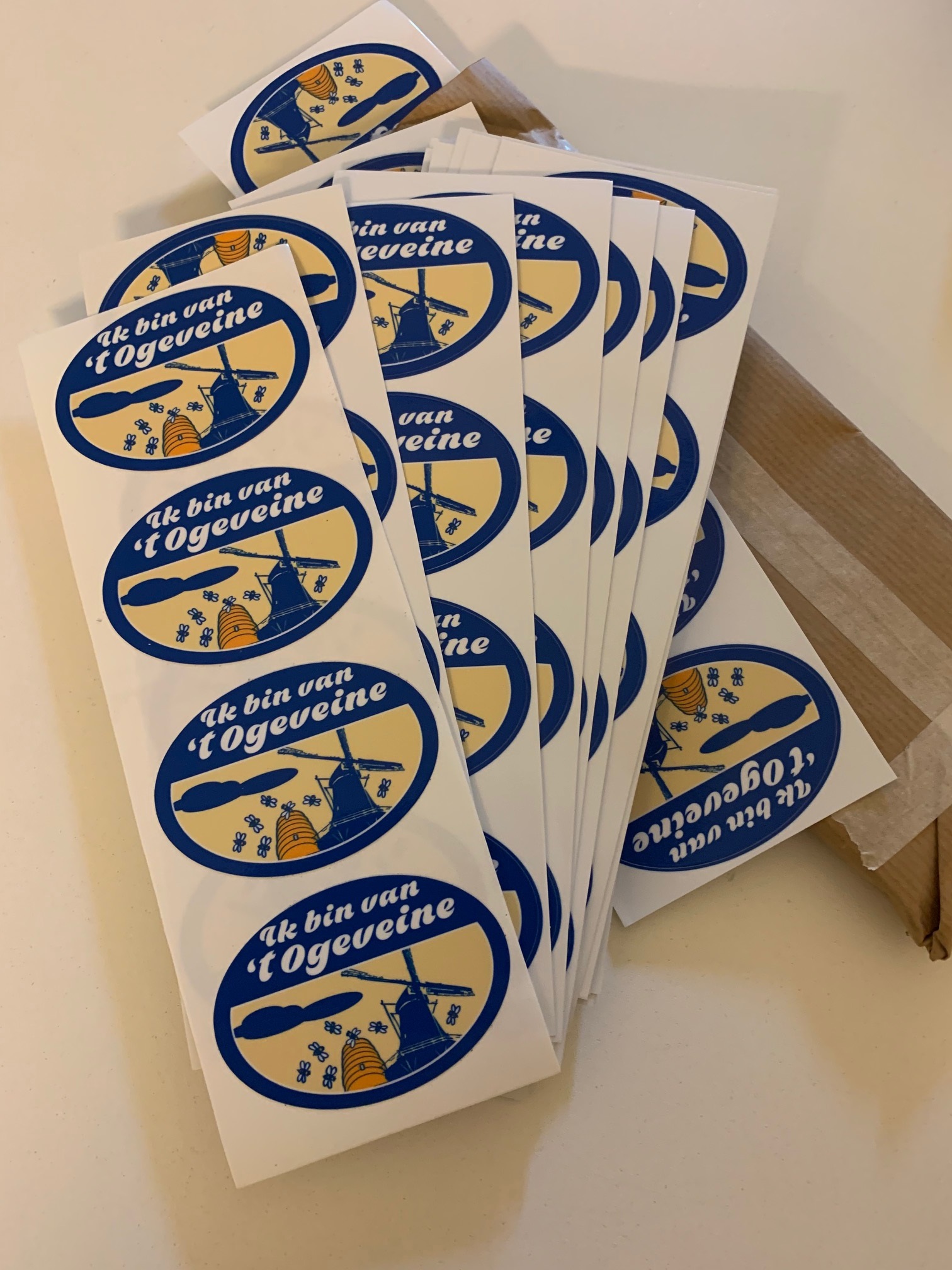 Initiatiefnemer Harald Buit krijgt een setje stickers aangeboden. Hij heeft met zijn bericht tienduizenden views gekregen en paar honderd steunbetuigingen. Daarvan ook reacties van opvallend ver weg. All over the world blijken oud-Hoogeveners dit stukje erg te zien zitten. Wellicht zijn de mensen die steden elders in de wereld kennen nog wel positiever over Hoogeveen dan wij die er nu plegen te wonen…..